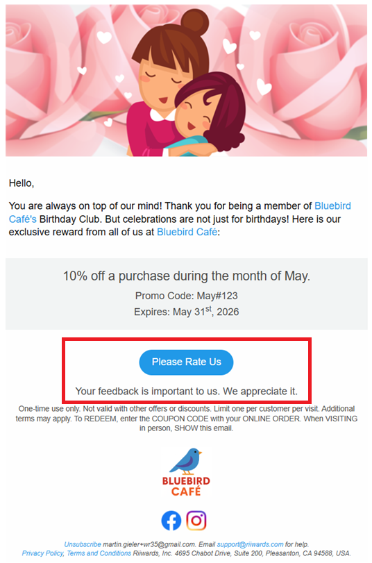 When the Customer Feedback feature is enabled, every reward email includes a feedback button.